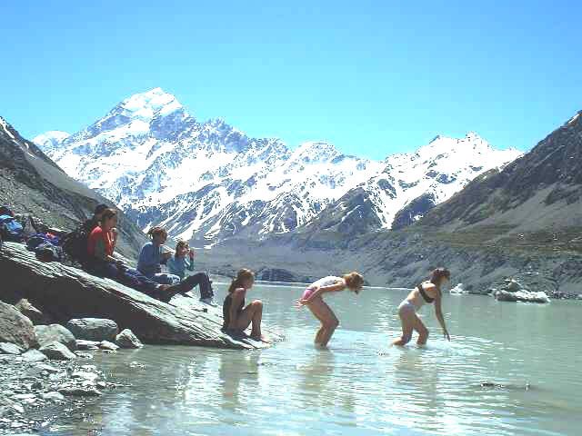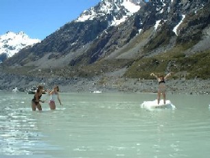 The snout of the large Muiler Glacier and its growing lake are close by. This beautiful alpine trail terminates at the new developing Hooker Glacier Lake where there are stones to skim, floating icebergs to view and icy waters that some have dared to swim.