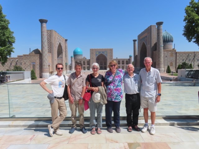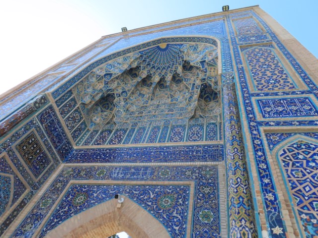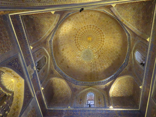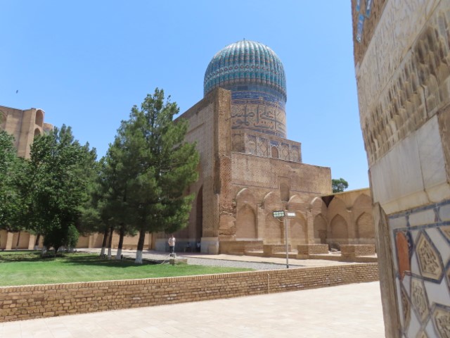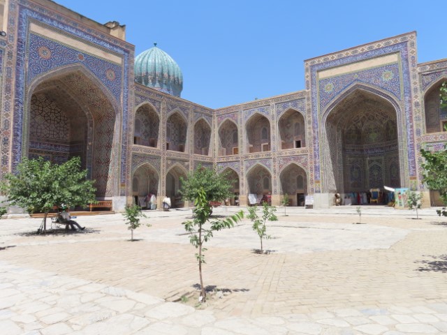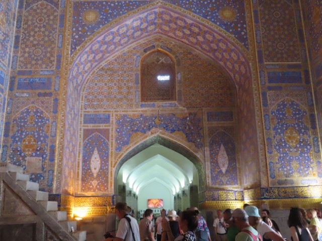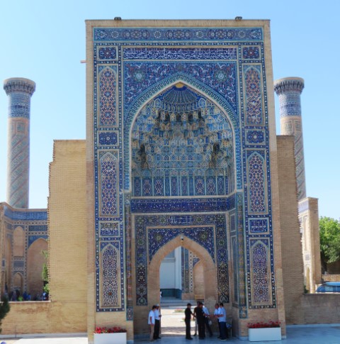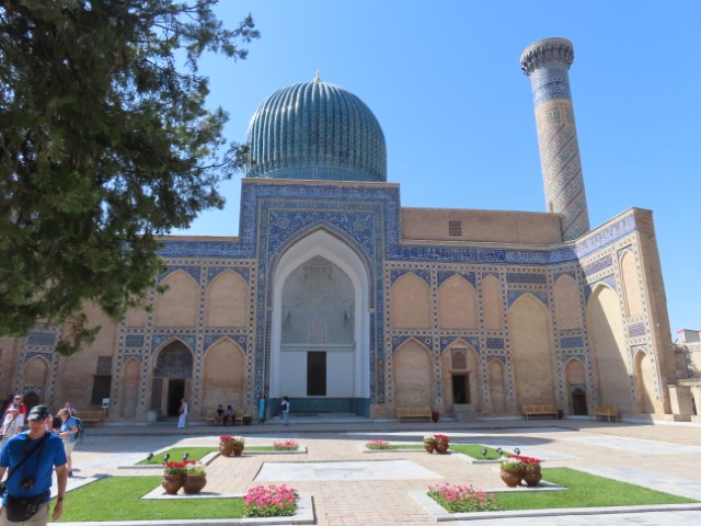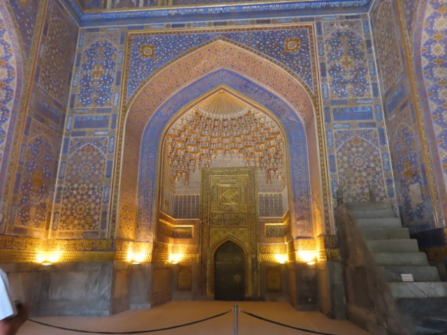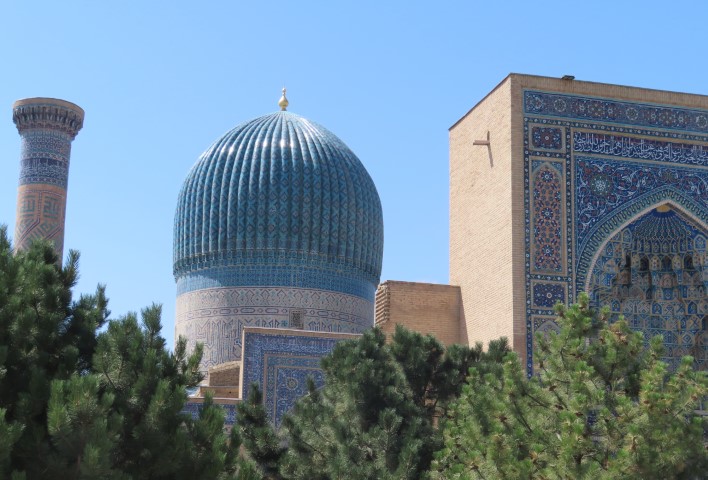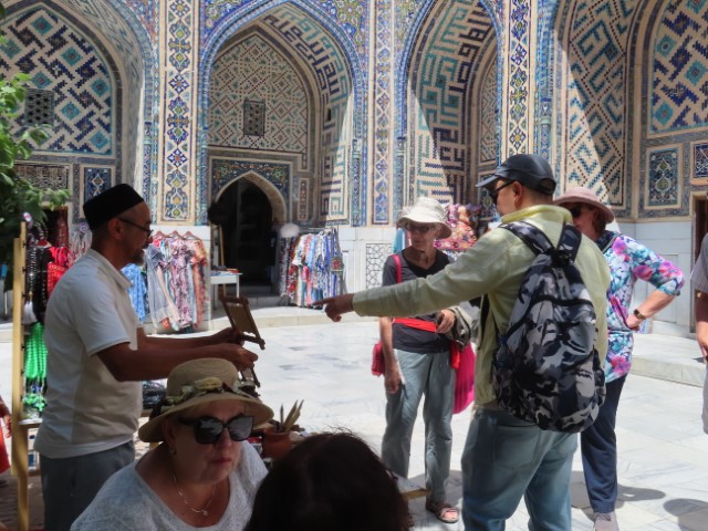 Four Golden Stans June 2023 08 Thu (18) Registan Square, museum and markets - Samarkand - Uzbekistan Temps to have headed to 39 deg. Dry air and a breeze helped. Visited beautifully and lovingly restored (starting 1930's) ancient mosque and mausoleum for an honored worrier, Amir Tamur, who invaded, slaughtered and conquered surrounding civilizations around 1300s after which hese buildings were constructed. Today they attract tourists to provide income. Afternoon rested in the cool hotel and checked inside eyelids.