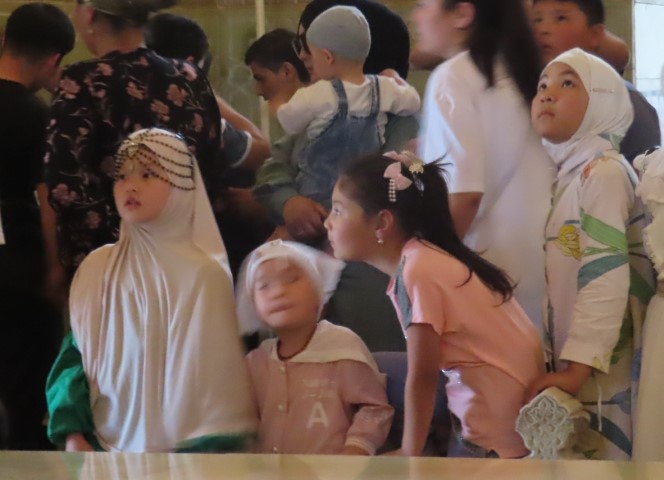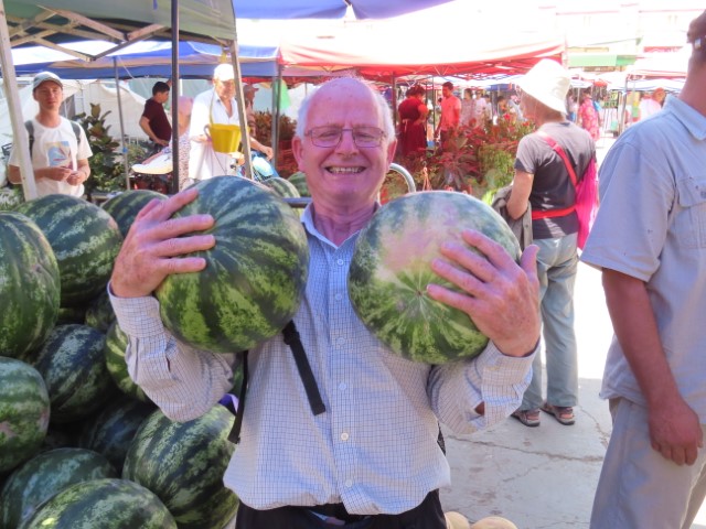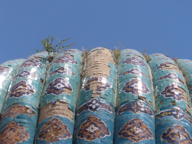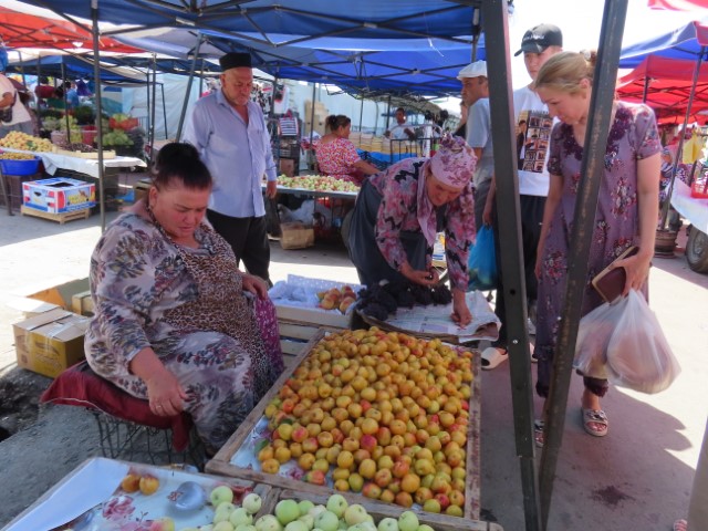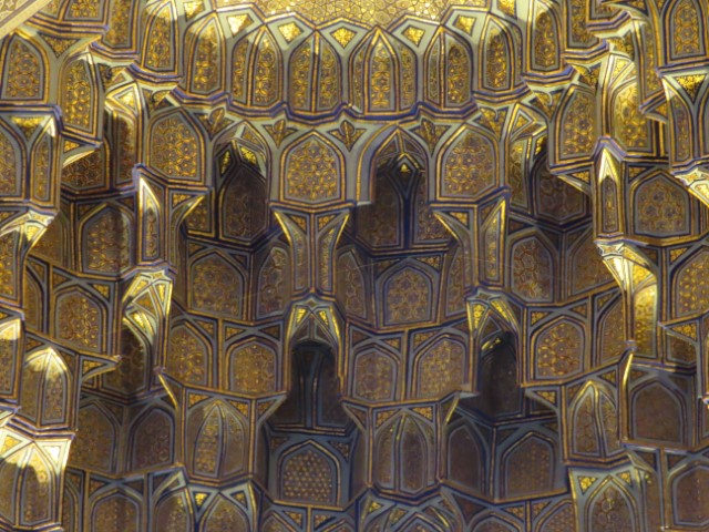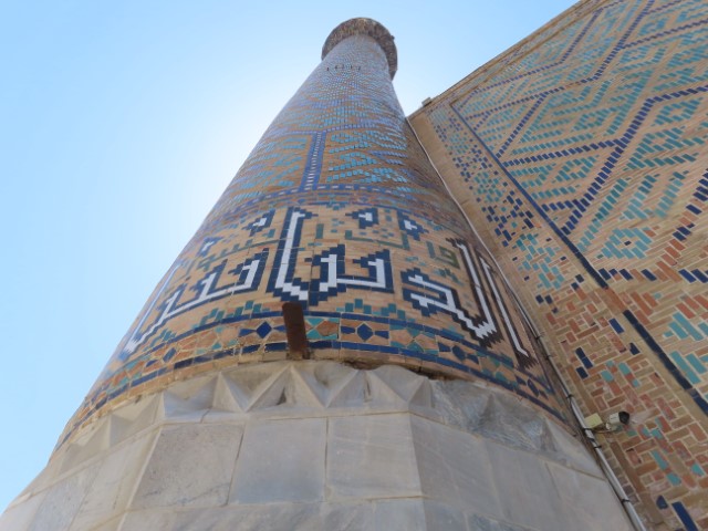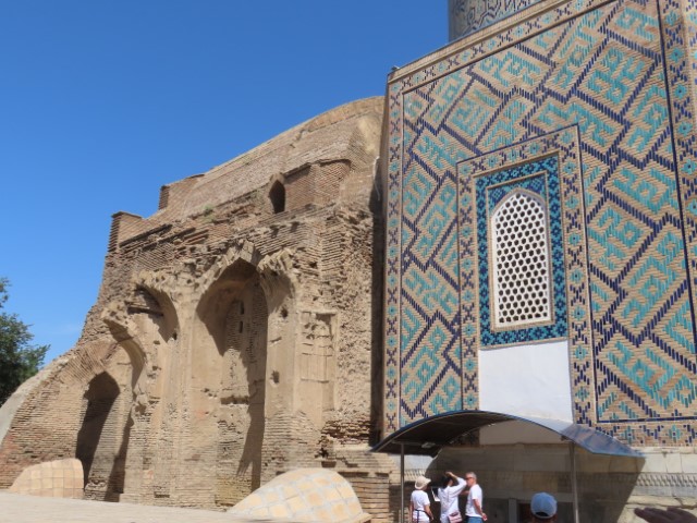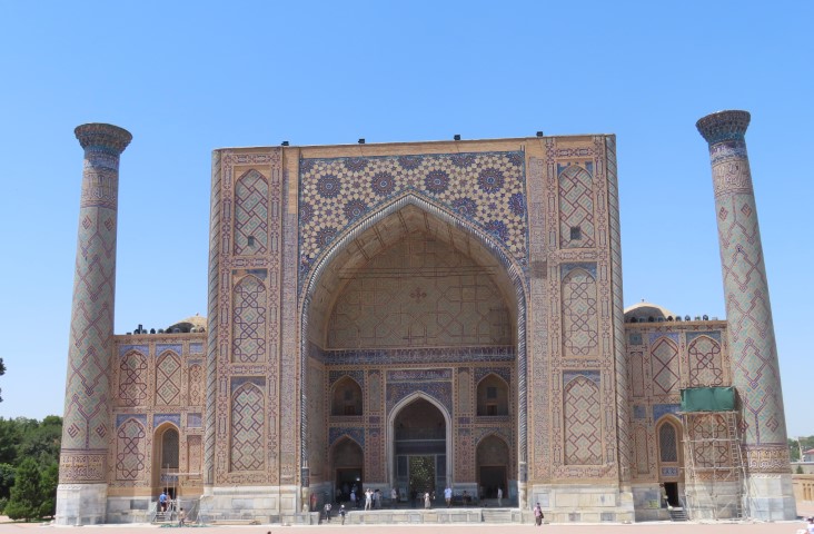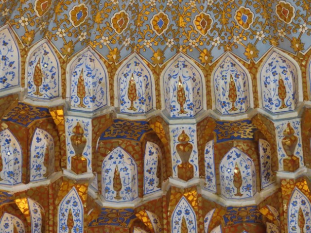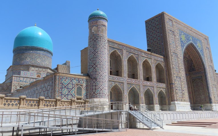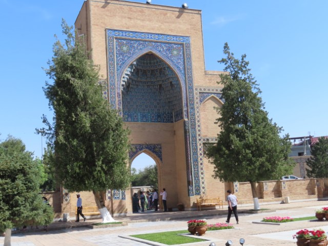 Four Golden Stans June 2023 08 Thu (18) Registan Square, museum and markets - Samarkand - Uzbekistan Temps to have headed to 39 deg. Dry air and a breeze helped. Visited beautifully and lovingly restored (starting 1930's) ancient mosque and mausoleum for an honored worrier, Amir Tamur, who invaded, slaughtered and conquered surrounding civilizations around 1300s after which hese buildings were constructed. Today they attract tourists to provide income. Afternoon rested in the cool hotel and checked inside eyelids.