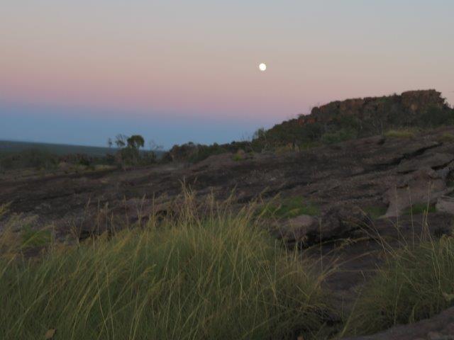 Began with the full moon and rising sun - caught a ranger talk an native culture then to Yellow Waters boat cruise (AU$70) with a few distractions on the way. Seemed to be held up in the park but definitely released tomorrow. Local schools are now on holiday so this may make a difference to access to sights. Never experienced any of the dreaded mosquitoes accused of dominating the world Heritage Area. Possibly due to camping away from water and elevated. Bush flies not that bad either.