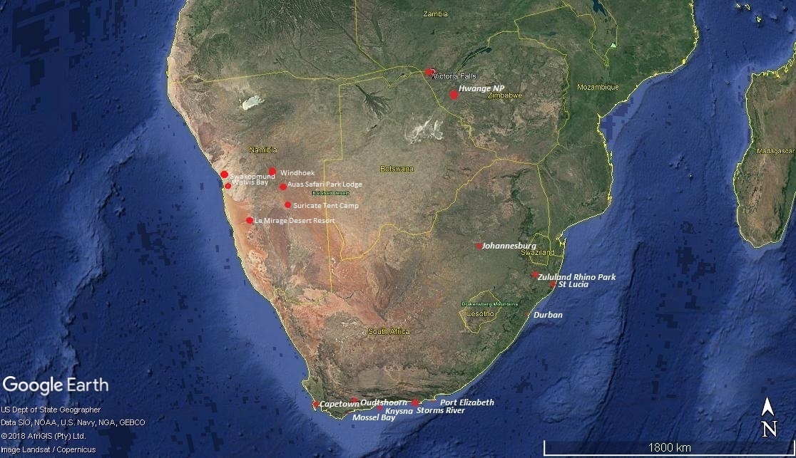 Itinerary (Links will operate when uploaded) Sat 30 Christchurch to Perth Sun 31 Perth to Victoria Falls Mon 1 To Victoria Falls Tue 2 Victoria Falls Wed 3 Victoria Falls Thu 4 Victoria Falls to Hwange National Park Fri 5 Hwange National Park Sat 6 Hwange National Park Sun 7 To Windhoek, Namibia Mon 8 Windhoek Tue 9 To Suricate Tented Canp - Sand dunes Wed 10 At Suricate for activities Thu 11 To Sossusvie & Namib Naukluft Park Fri 12 At Namib Naukluft NP Sat 13 To Swakopmund Sun 14 At Swakopmund Mon 15 Depart Windhoek Tue 16 - Arrive Perth Wed 17 Depart Perth late Arrive Christchurch Thurs 18 0020hrs |