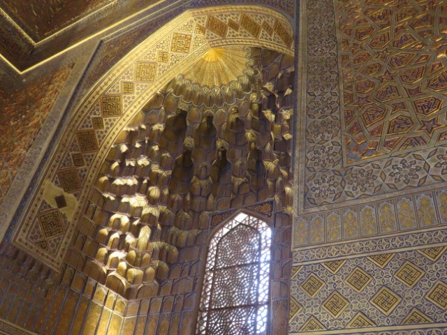 Four Golden Stans June 2023 08 Thu (18) Registan Square, museum and markets - Samarkand - Uzbekistan Temps to have headed to 39 deg. Dry air and a breeze helped. Visited beautifully and lovingly restored (starting 1930's) ancient mosque and mausoleum for an honored worrier, Amir Tamur, who invaded, slaughtered and conquered surrounding civilizations around 1300s after which hese buildings were constructed. Today they attract tourists to provide income. Afternoon rested in the cool hotel and checked inside eyelids.