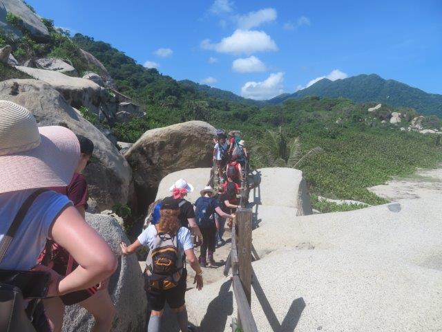 Tayrona National Park Head to Tayrona National Park, a protected plot of wilderness encircled by the massive Santa Marta mountain range on one side and the picture-perfect Caribbean on the other. There's a fair amount of hiking involved today, so be prepared and make sure your walking shoes are on (bug spray will also come in handy). It's a solid hour or two to hike to the first beach, with a few up and down parts, and if it rains it may get a little muddy here and there. The reward, however, is not only the superb beaches but the hike itself. The ambience of the jungle, the verdant scenery and the first glimpse of the sea make for a magical day out among nature. The hiking is flexible; you can hike more or less, depending on your wishes and energy levels. The hike to stunning Cabo San Juan is well worth the effort; it's further away than some other beaches however highly recommended. Note that it's not possible to swim at all beaches, as the ocean rip can be strong. When it's all over, we head back to Guachaca for the night. Hot humid tropical weather, Rain in the evening Nice cooled lunch and great swim